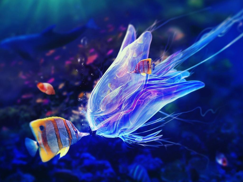 Море, рыбки, медуза обои для рабочего стола, картинки, фото, 1024x768. | ||||||||||||||||